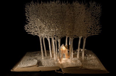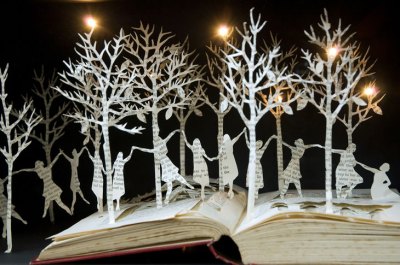 Su Blackwell equals magic, she creates 3D paper cut sculptures out of old books in the most cute, romantic and detailed manner, she is amazing! she puts the sculptures inside wooden boxes and then she lights them up! i want a beautiful white living room with wooden tables and then i want her art work for decorate the whole house! her hands are like the most delicate flowers, because this is sooo hard to do, is an spectacular work,