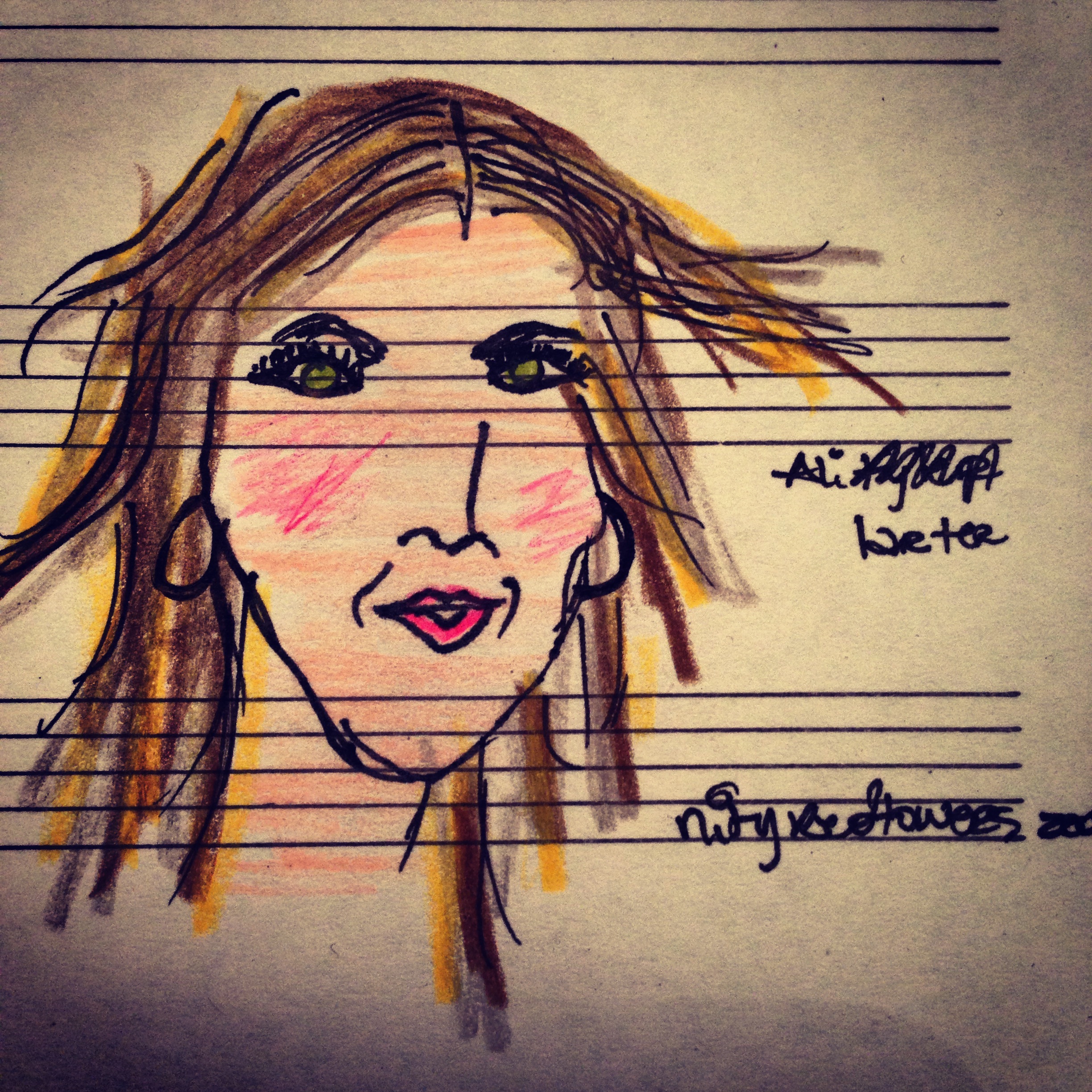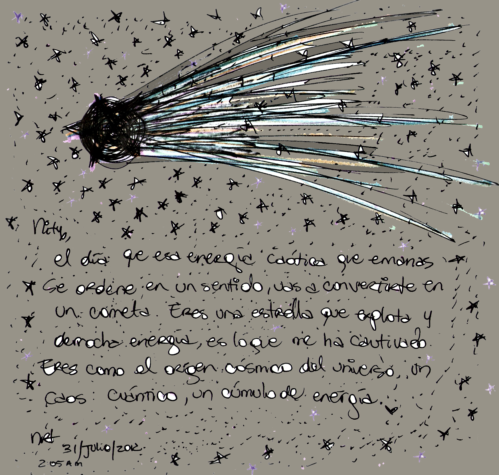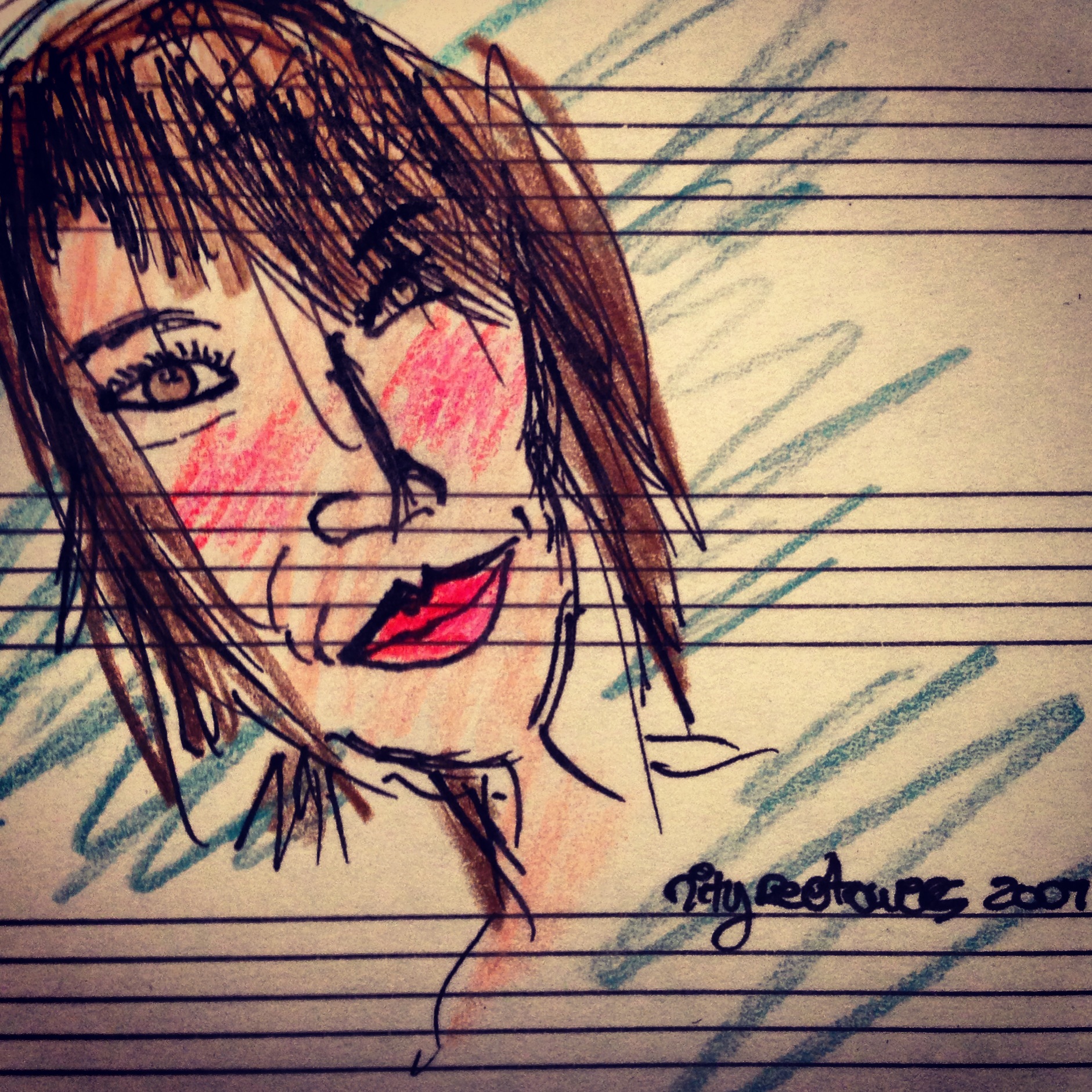 no sé pintar, ni dibujar, ni colorear, ni ilustrar, ni recortar, ni escribir, solo me relaja, me divierte y me hace feliz, me ayuda a descargar lo que en palabras y lágrimas a veces no puedo expresar y es que cuando se me mete que tengo que dibujar a alguien no puedo dormir y debo levantarme, prender la luz y sentarme en cama a hacerlo, no boceteo, lo hago de una, así salga bien o no, plasmando sobre papel mis sentimientos en colores o no ♥